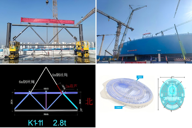 本次首吊的鋼桁架位于屋蓋起始安裝區(qū)域,單榀重量2.8噸。面對屋蓋結(jié)構(gòu)面積大、體量大、跨度大,構(gòu)件節(jié)點三維坐標(biāo)精確定位難等挑戰(zhàn),集團建設(shè)團隊創(chuàng)新采用“地面拼裝、整榀吊裝”方案,多臺大型起重機械協(xié)同作業(yè)。同時,通過強化計算分析、嚴控拼裝精度、精準(zhǔn)測量定位、嚴把焊接質(zhì)量,確保吊裝安全與施工質(zhì)量雙可控,助力實現(xiàn)首吊圓滿成功。